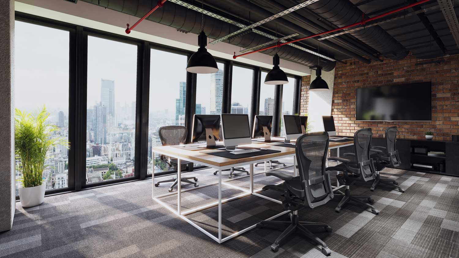 - Oficinas y despachos: estaciones de trabajo, zonas comunes, salas de reunión.